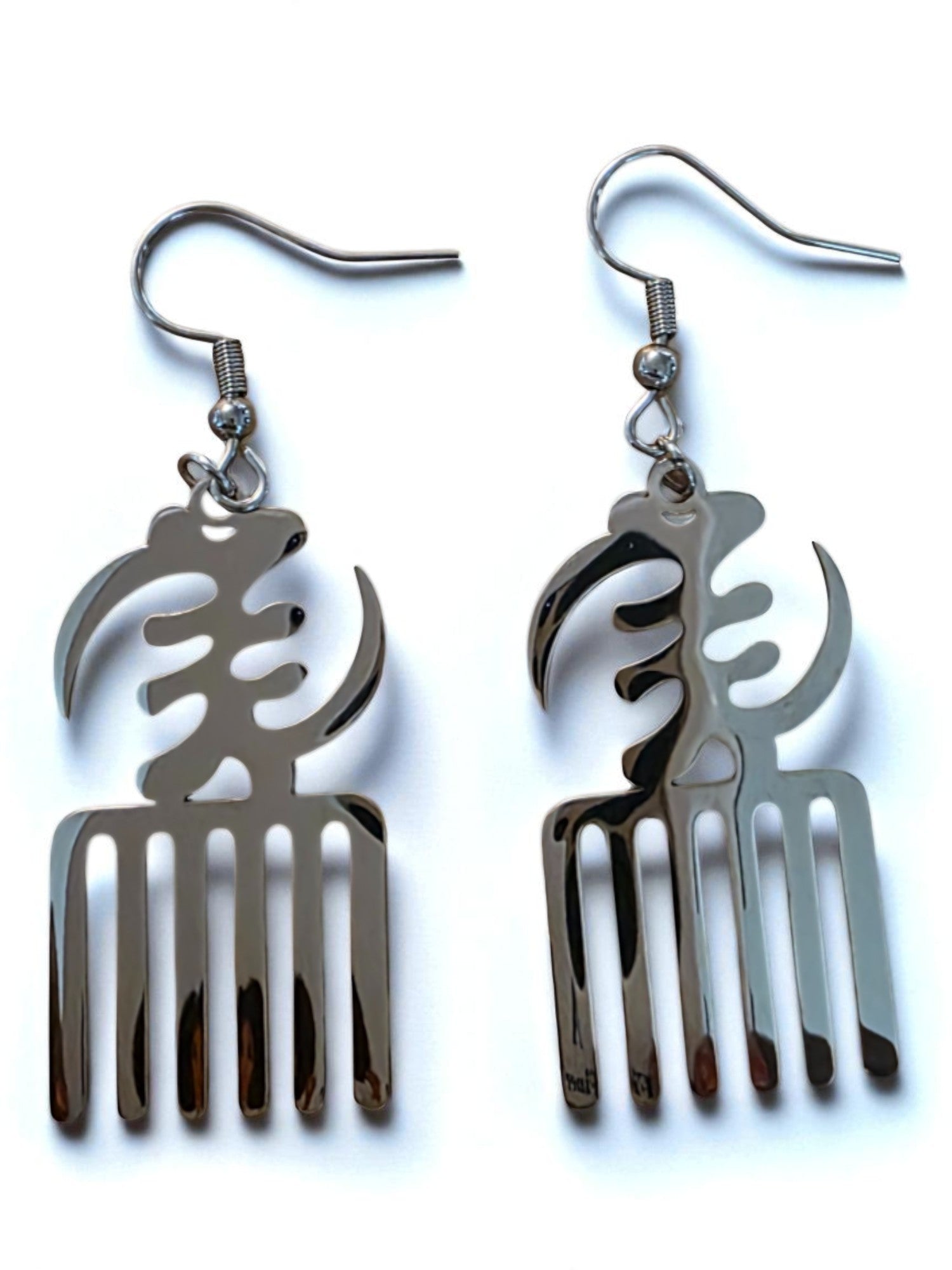 These stunning Duafe comb with Gye Nyame earrings celebrate traditional Ghanaian Adinkra symbols with contemporary style. Representing beauty, femininity, and good hygiene, the Duafe symbol is transformed into wearable art that makes a powerful cultural statement. The Gye Nyame expresses the omnipresence of God.