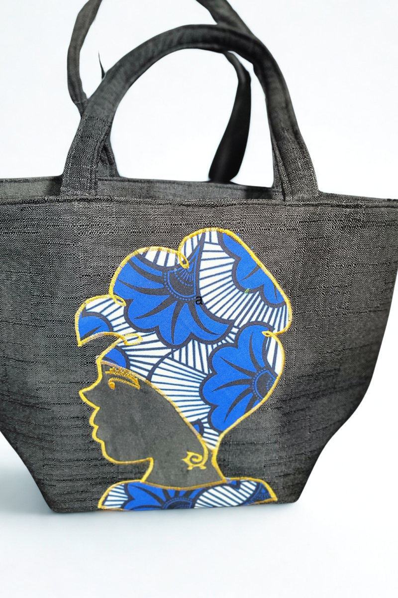 Elevate your accessory game with this Ghanaian Ankara Print Canvas Tote Bag, a stunning blend of modern functionality and African heritage. Designed for the fashion-forward individual, this tote features a striking embroidered silhouette of an African woman adorned in vibrant blue and white Ankara fabric set against a sleek black background for a bold yet sophisticated statement.